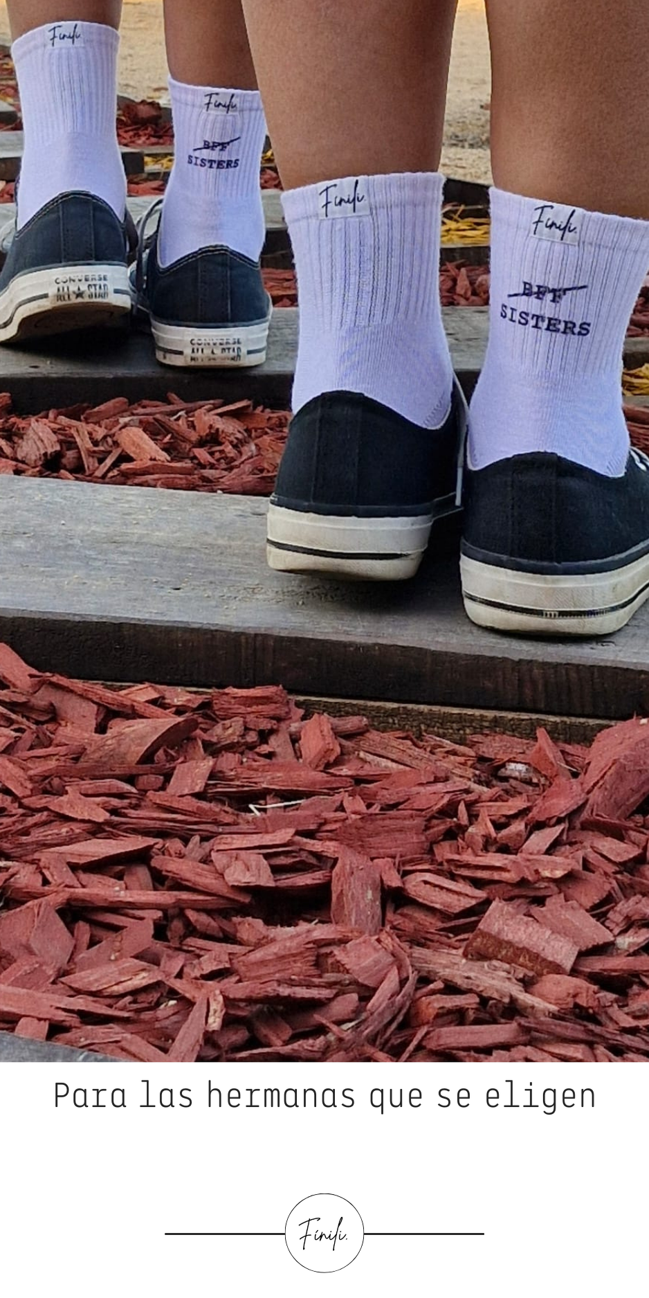 Calcetas blancas con diseño minimalista en negro y la frase “BFF SISTERS” ♡ creadas para celebrar la amistad como un lazo de hermandad, pack de 2 pares, uno para cada amiga.