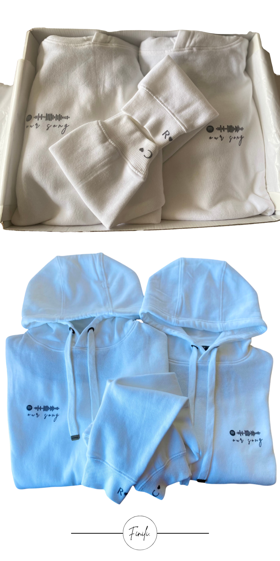 Un pack de polerones para llevar la canción que los une ♡ incluye un código de Spotify escaneable y una frase o fragmento de letra personalizada, con el diseño limpio y minimalista de Finili.